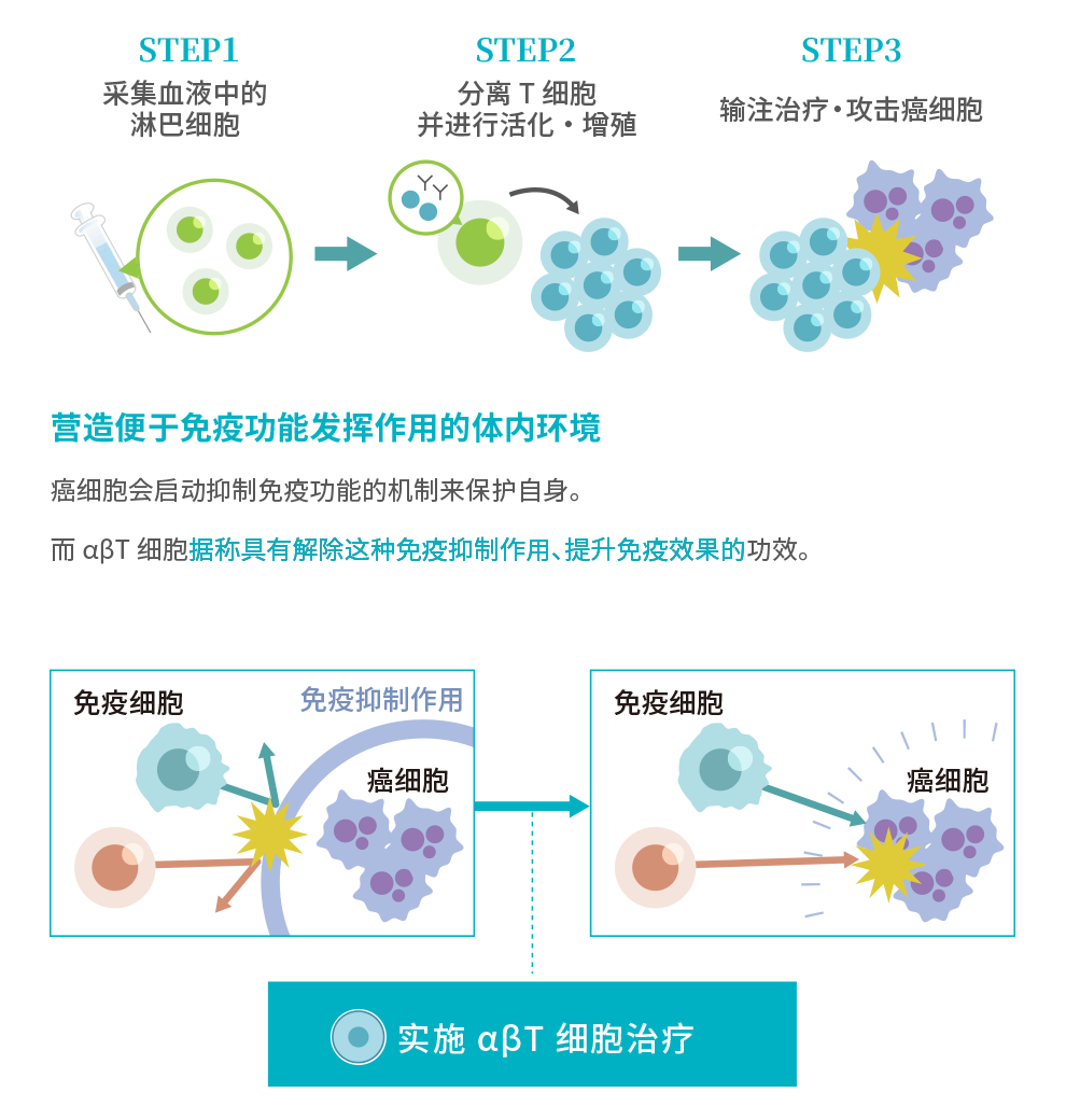 ![[STEP1]采集血液中的淋巴细胞→[STEP2]分离 T细胞并进行活化・增殖→[STEP3]输注治疗・攻击癌细胞/【营造便于免疫功能发挥作用的体内环境】癌细胞会启动抑制免疫功能的机制来保护自身。而 αβT细胞据称具有解除这种免疫抑制作用、提升免疫效果的功效。◎实施 αβT细胞治疗](/operation/cancer_immunotherapy/images/item03_fr3_fig1.png)