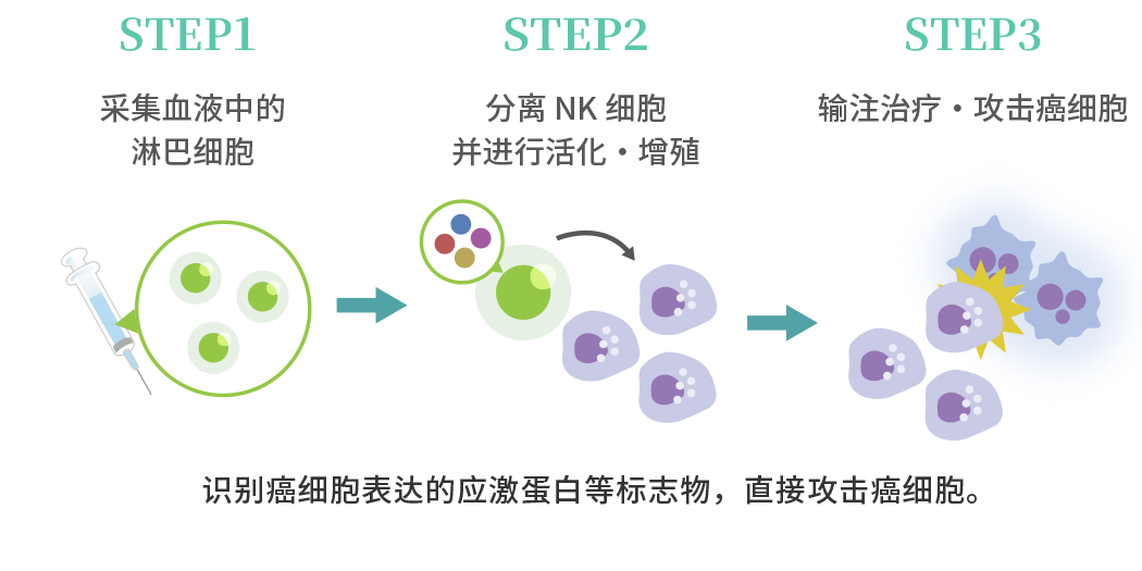 ![[STEP1]采集血液中的淋巴细胞→[STEP2]分离 NK细胞并进行活化・增殖→[STEP3]输注治疗・攻击癌细胞/识别癌细胞表达的应激蛋白等标志物,直接攻击癌细胞。](/operation/cancer_immunotherapy/images/item03_fr4_fig1.png)