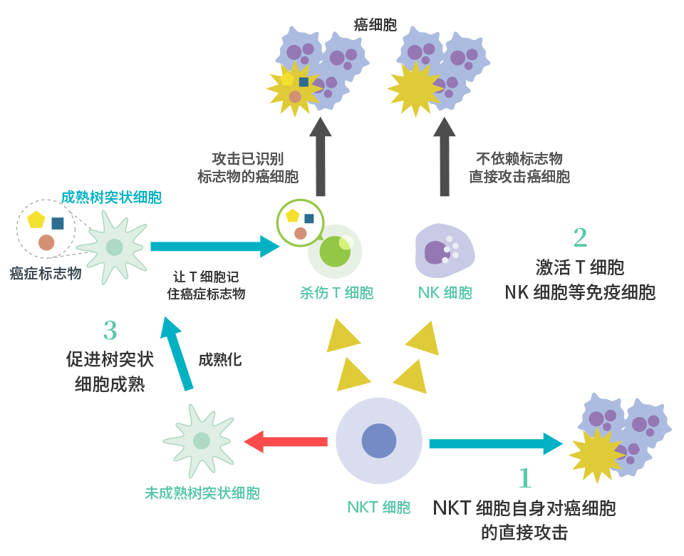 ![①[NKT细胞]NKT细胞自身对癌细胞的直接攻击 ②[NKT细胞]激活 T细胞、NK细胞等免疫细胞 [NK细胞]不依赖标志物 直接攻击癌细胞 [杀伤 T细胞]攻击已识别标志物的癌细胞 ③[NKT细胞]促进树突状细胞成熟→[成熟树突状细胞]让 T细胞记住癌症标志物](/operation/cancer_immunotherapy/images/item03_fr5_fig1.png)